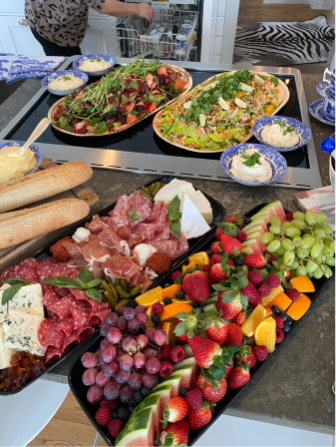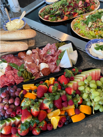 Vi gör bla våra populära sallader på stora fat, härliga fruktfat & ost/charkfat.