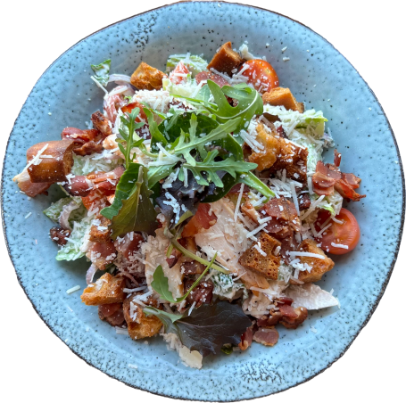 Kyckling, romansallad, tomat, rödlök & caeserdressing. Toppas med krutonger & bacon